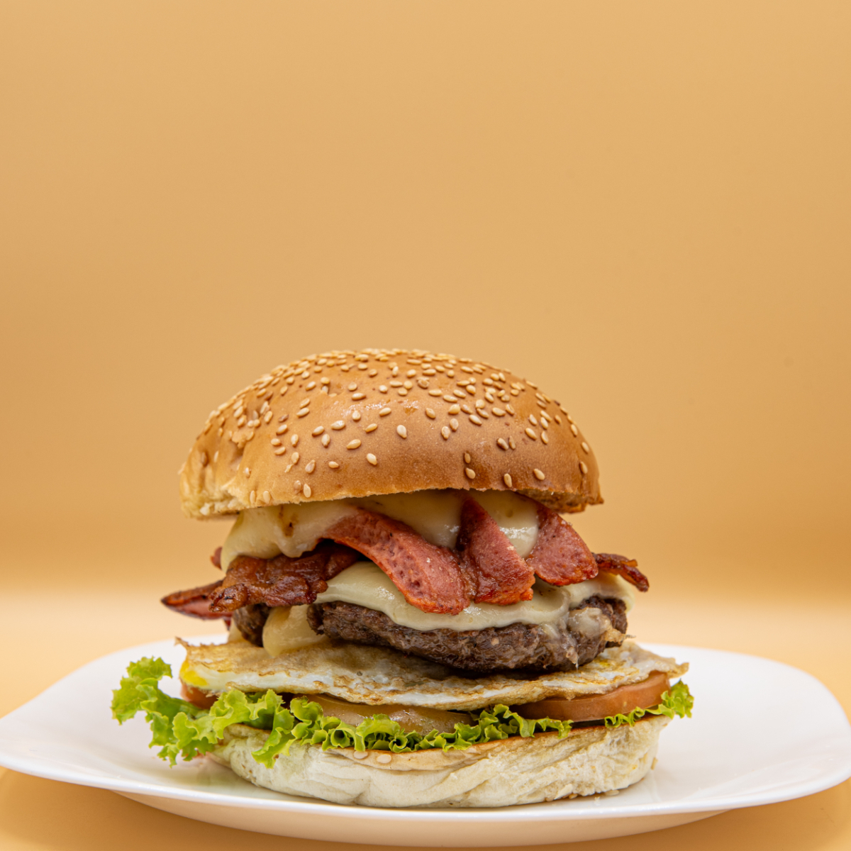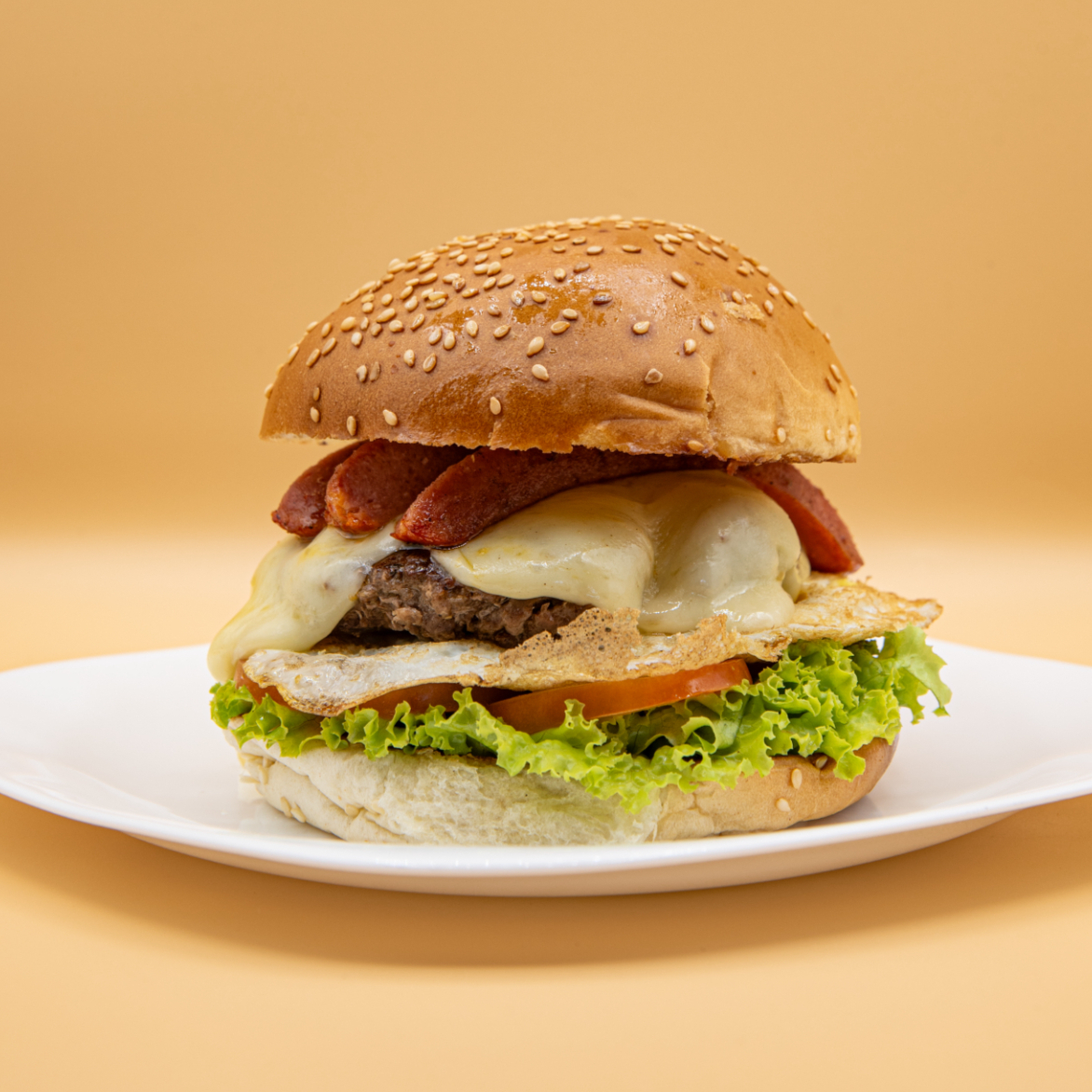 Pão, hambúrguer artesanal, queijo, bacon, salsicha, ovo e salada.