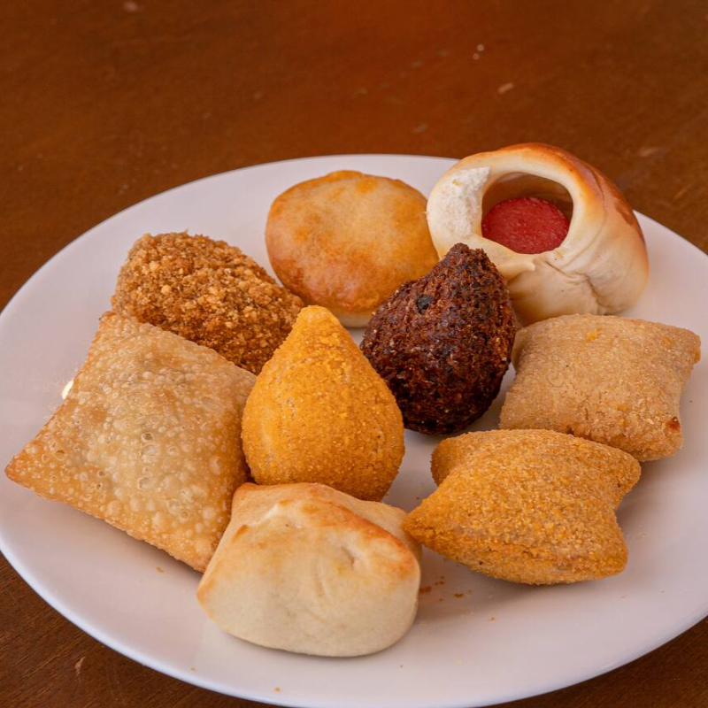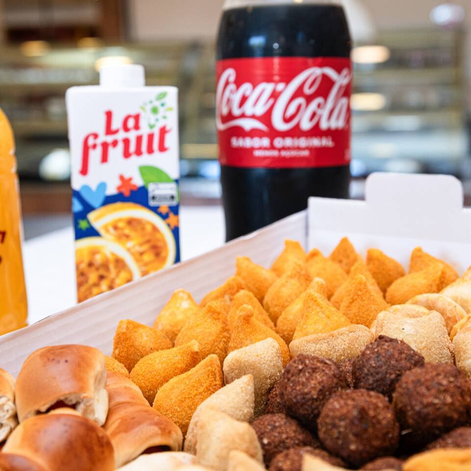 50 mini salgadinhos (variados) + 01 coca cola 2lts + 01 sucos de laranja natural 1lt (Imagem apenas ilustrativa do produto)