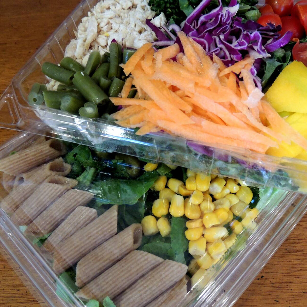 Foto inlustrativa* Macarrão, alface, couve, azeitona, tomate cereja, milho.