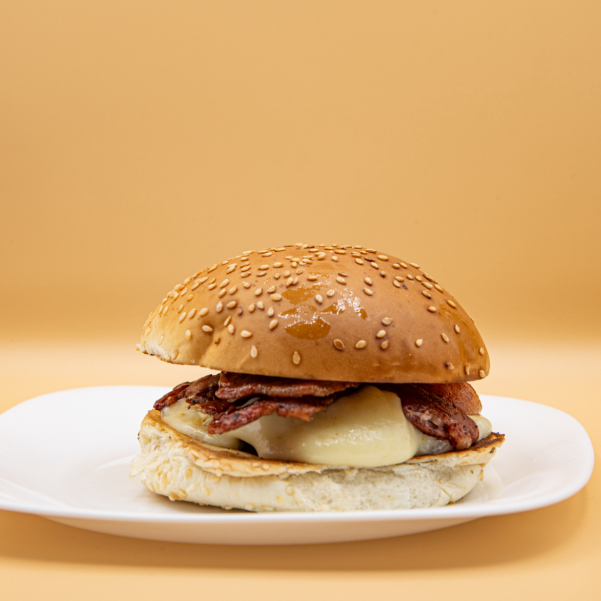 Pão, hambúrguer artesanal, queijo e bacon.