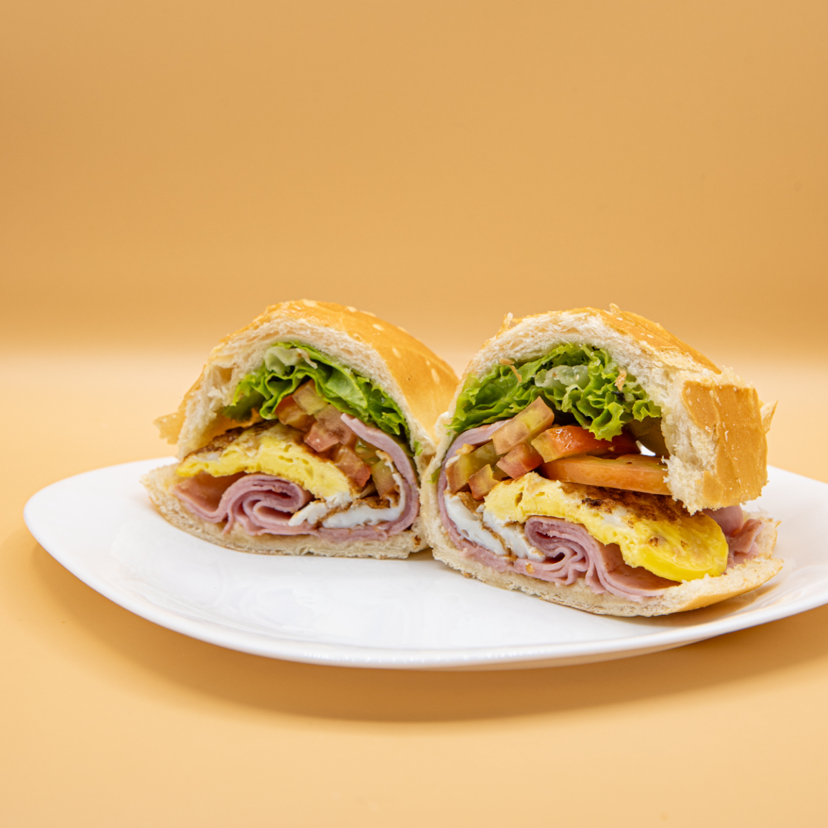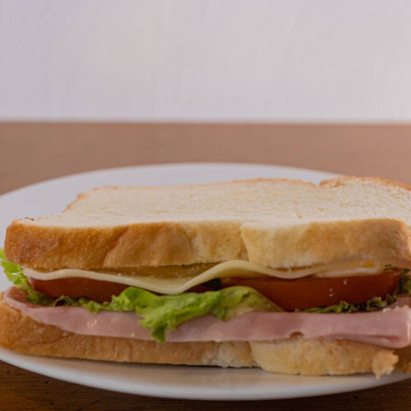 Pão de forma normal, 1 fatia de presunto, 1 fatia de mussarela, alface, tomate.
