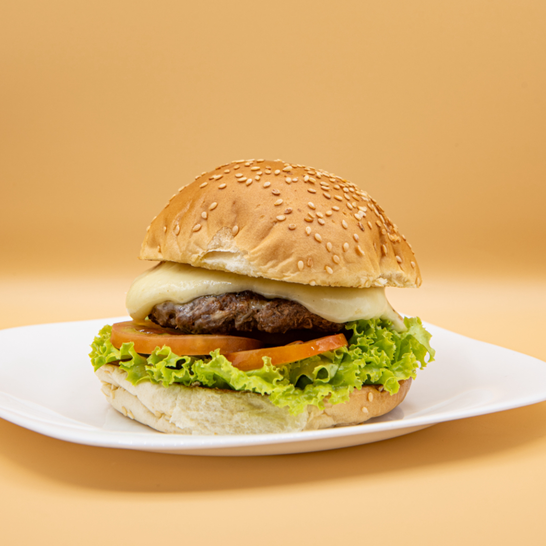 Pão, hamburguer artesanal, queijo e salada.