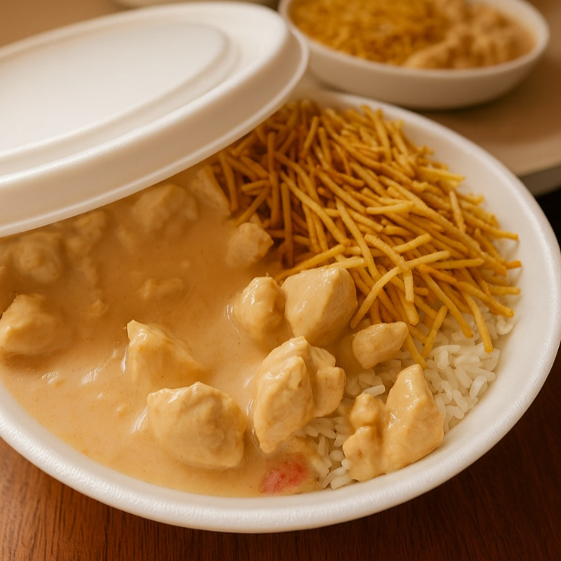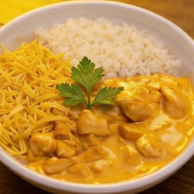 Acompanha: Arroz soltinho, batata palha é strogonof cremoso com ketchup