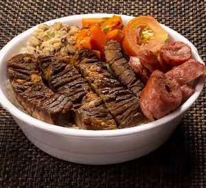 Carne na Chapa e linguiça frita . Acompanha : Arroz que pode ser branco ou temperado ,feijão de caldo ou feijão preto, salda crua ou cozida( pode ir alface , tomate , repolho , pepino , abobrinha , chuchu , quiabo, bereinjela) Obs: macarrão pode ir como cortesia não obrigatório. Marmita individual , redonda serve 1 pessoa , Aprox 400g.
