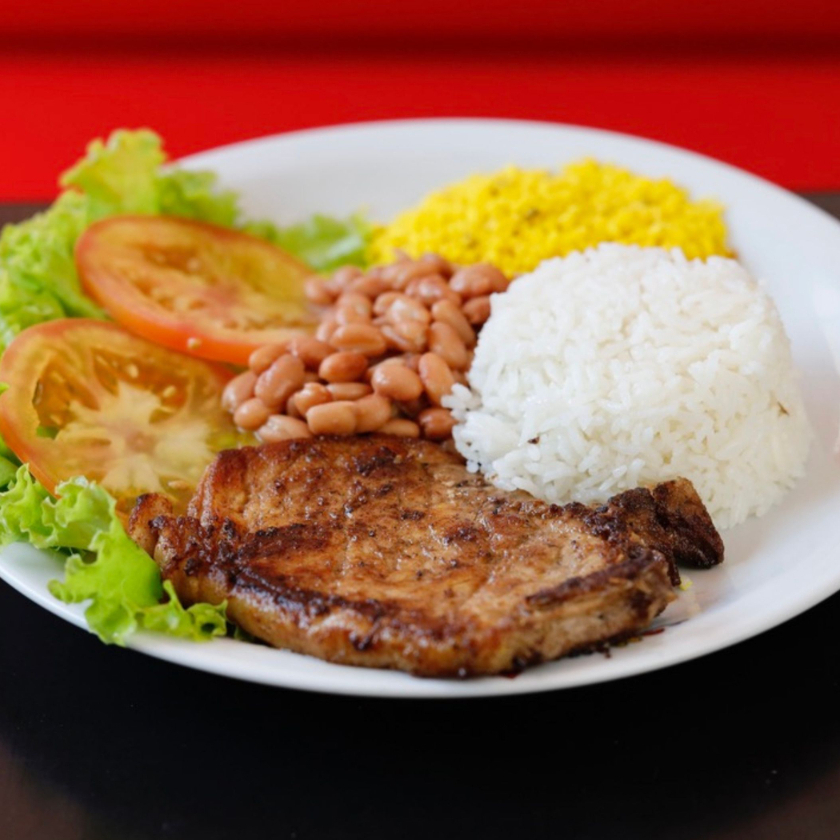 Arroz branco, feijão de caldo, farofa, bisteca suína, salada alface e tomate