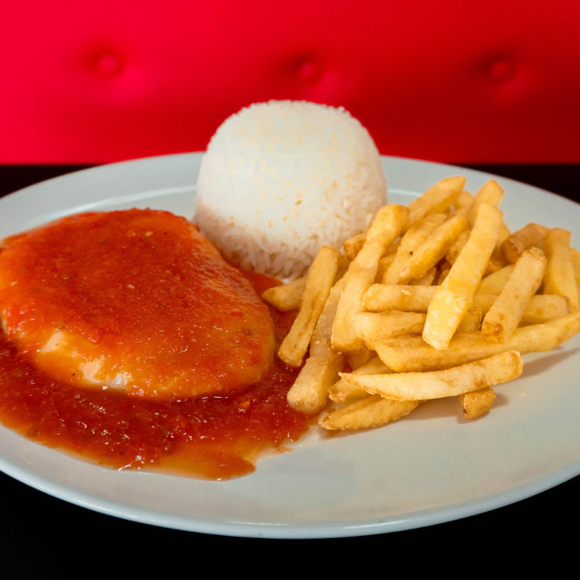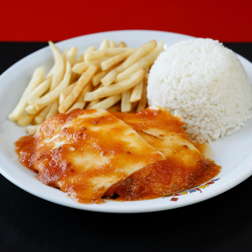 Arroz branco, batata frita, parmegiana de filé mignon