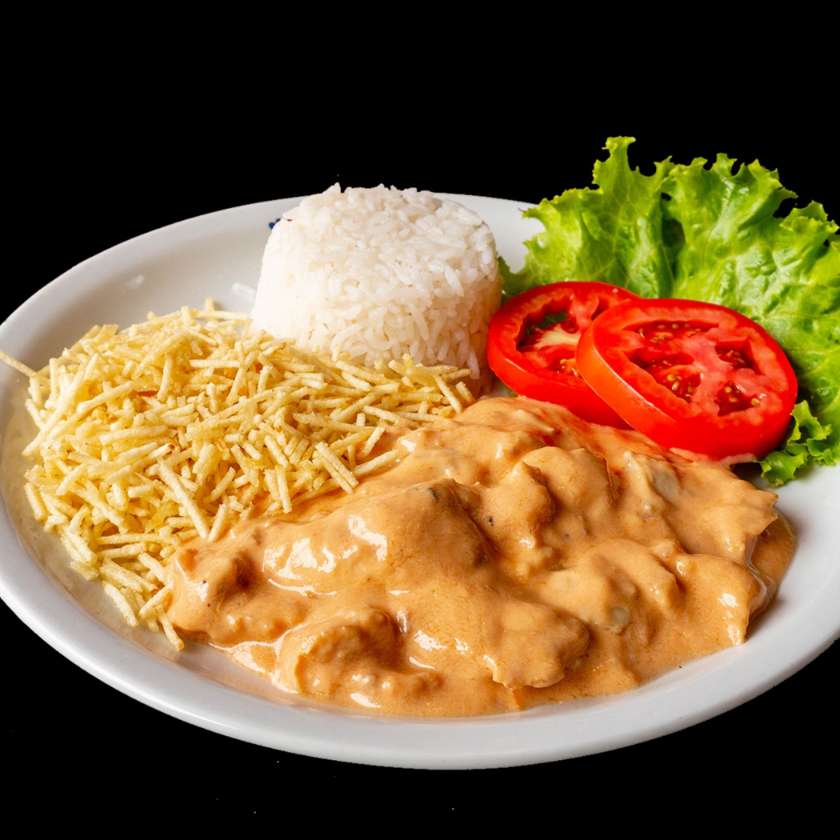 Arroz branco, estrogonofe de frango, batata palha, salada alface e tomate