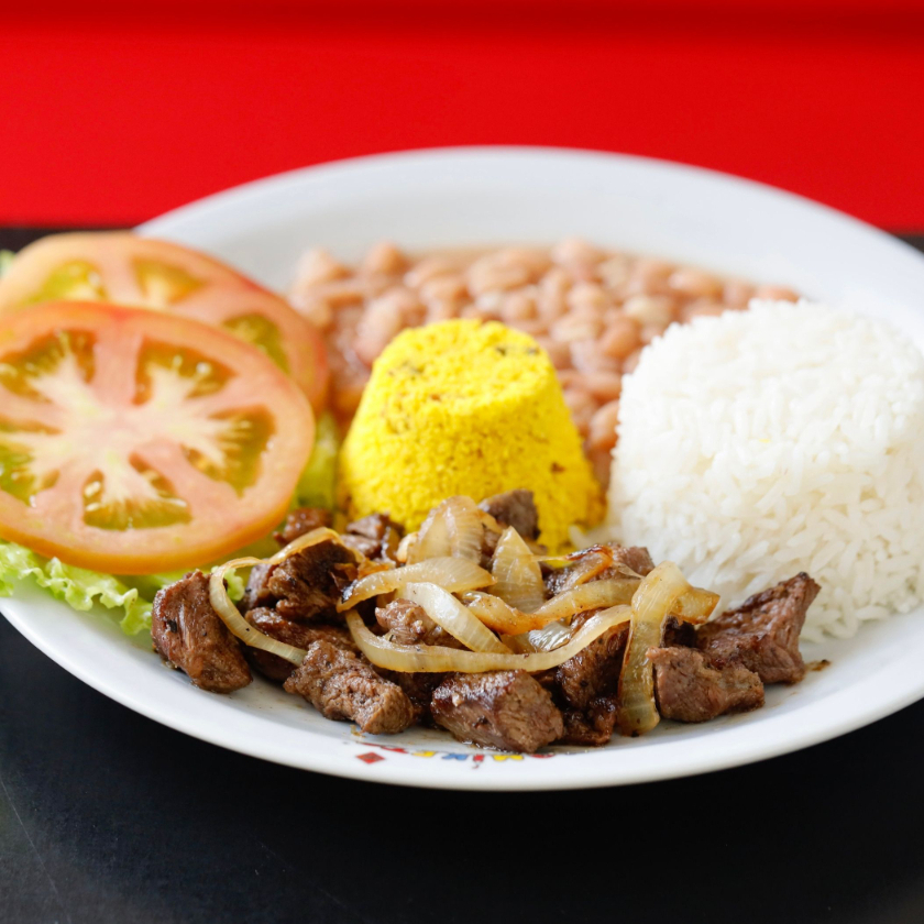 Arroz branco, feijão de caldo, farofa, picadinho de carne acebolado, salada de alface e tomate