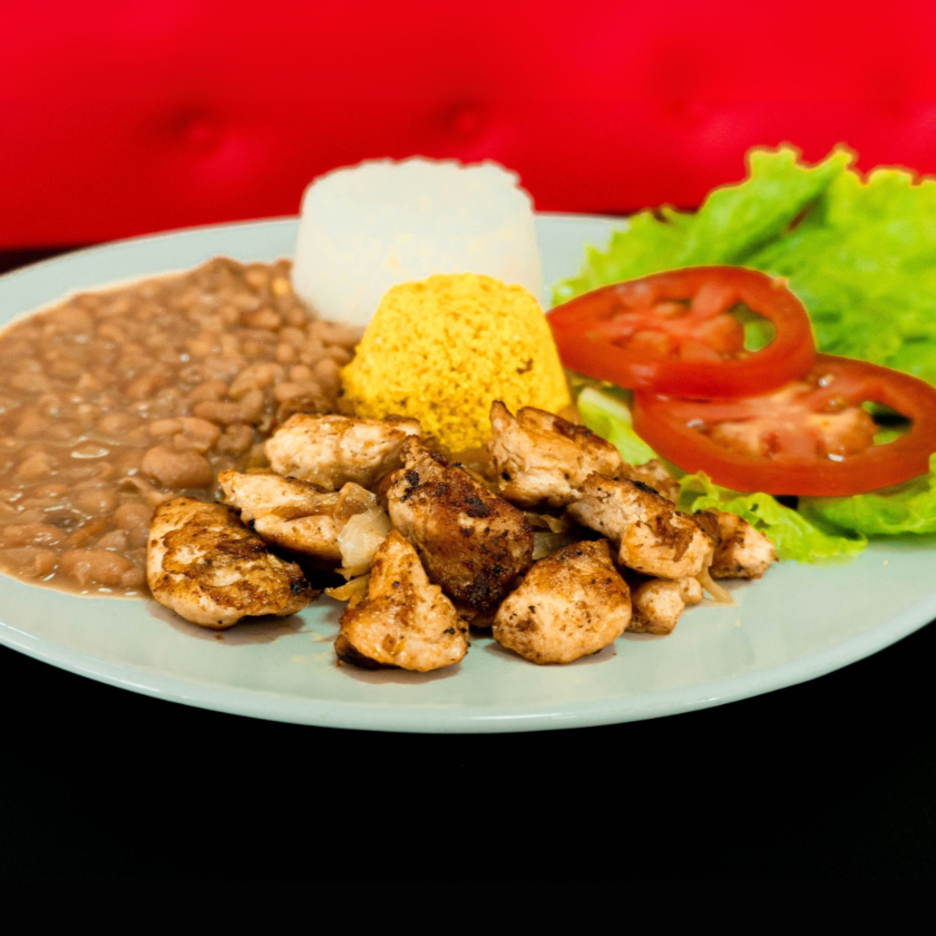 Arroz branco, feijão de caldo, farofa, picadinho de frango acebolado, salada tomate e alface