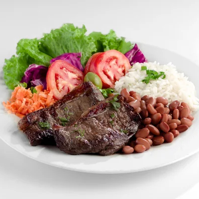 Arroz, Feijão, Bife bovino, farofa e Salada.