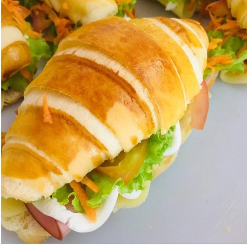 Pão folhado, Peito de peru, alface, tomate, cream cheese e cenoura ralada. 150g