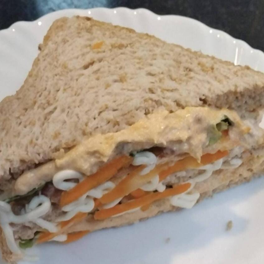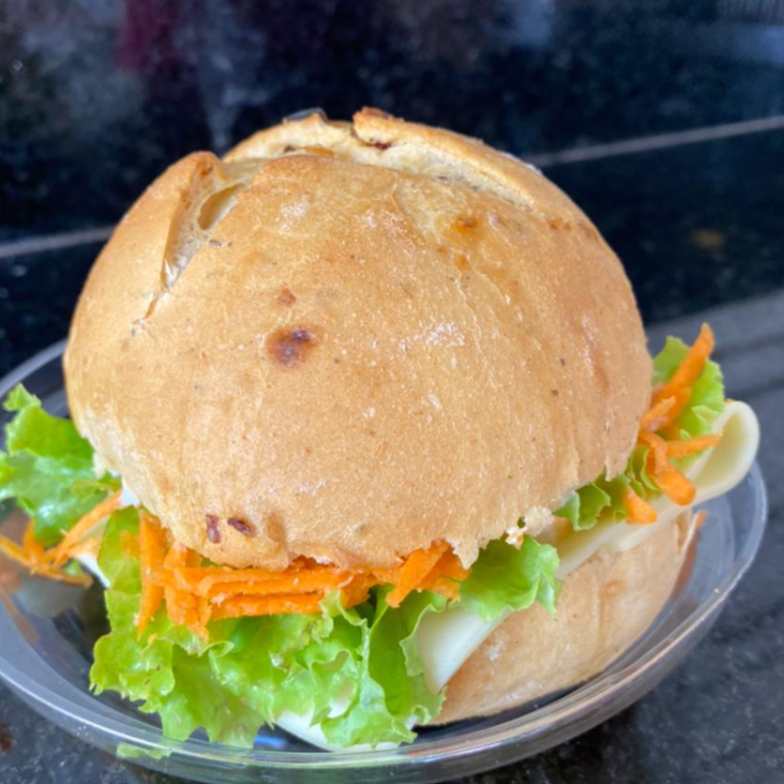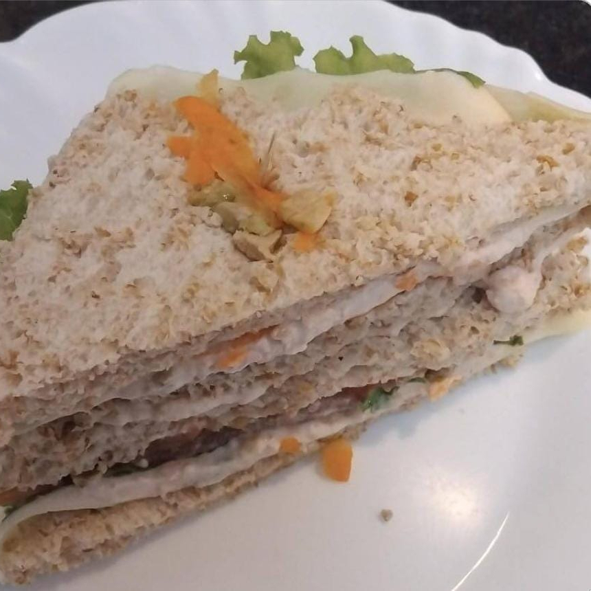 Pão Integral, Patê de Frango, Alface, Tomate, Creme Cheese e Cenoura Ralada.