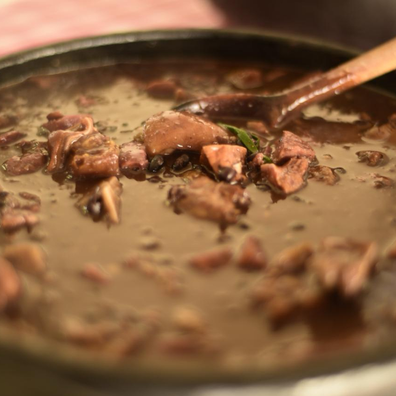 Feijoada, Arroz, vinagrete, laranja, torresmo, couve e lfarrofa.
