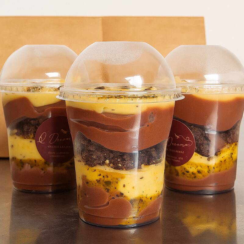 Deliciosa Sobremesa com brigadeiro cremoso, e brigadeiro de maracujá, e pedaços com Brownie. Emb 250ml