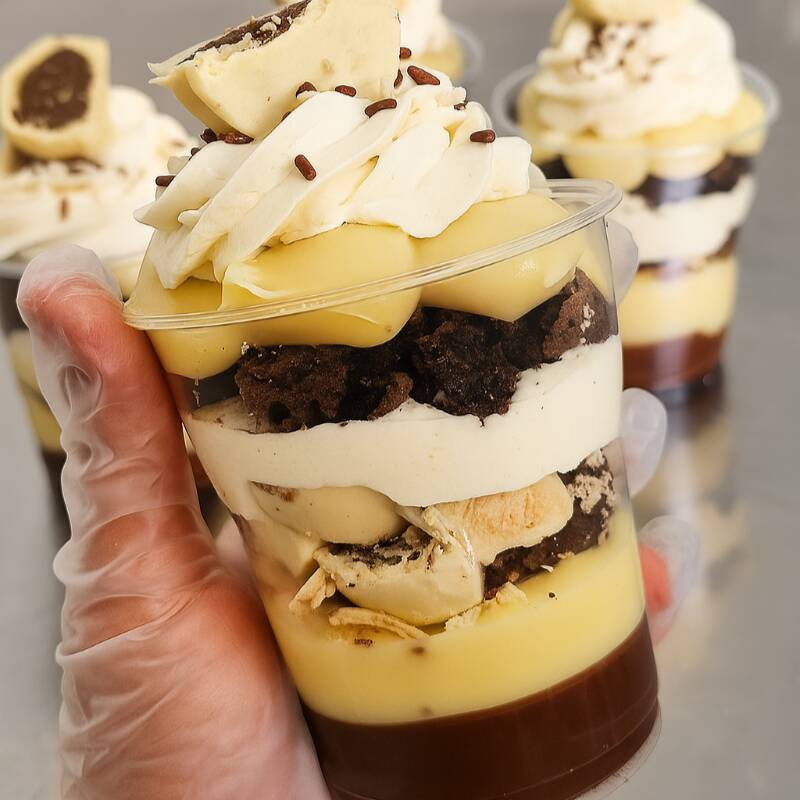 Uma deliciosa sobremesa feita com brigadeiro cremoso chocolate 50% cacau, pedaços de bombom Ouro Branco e Brownie. Aprox 230g..