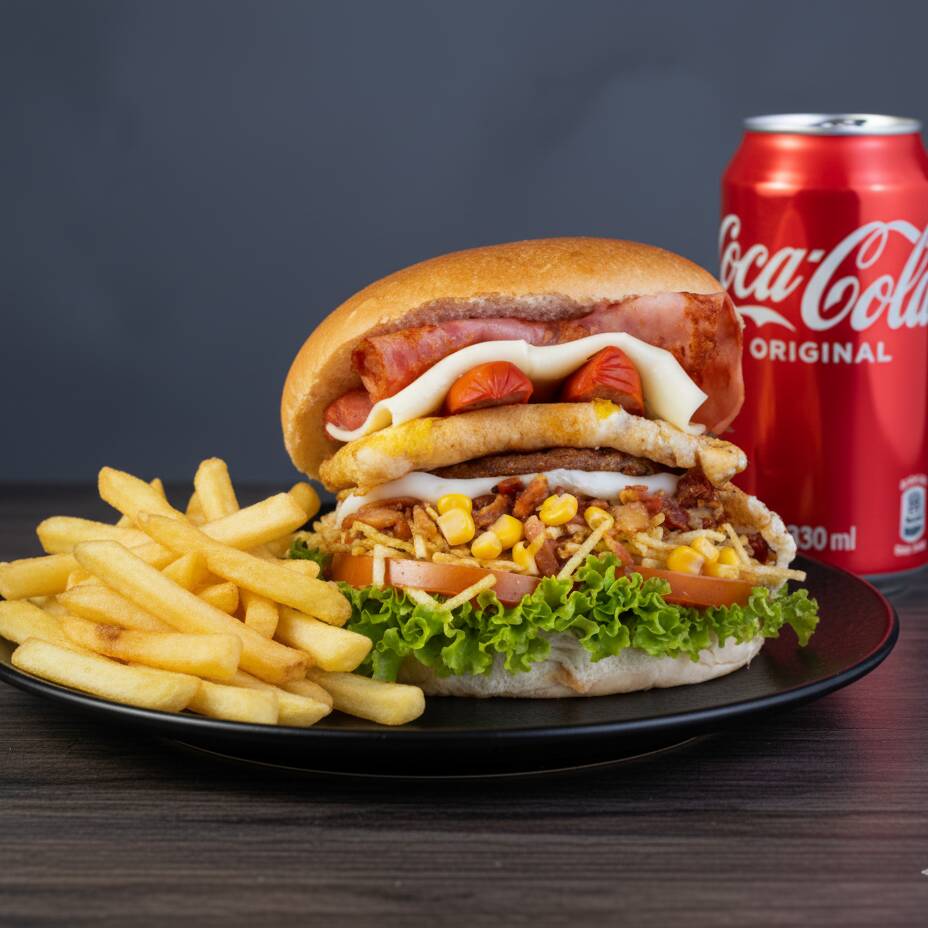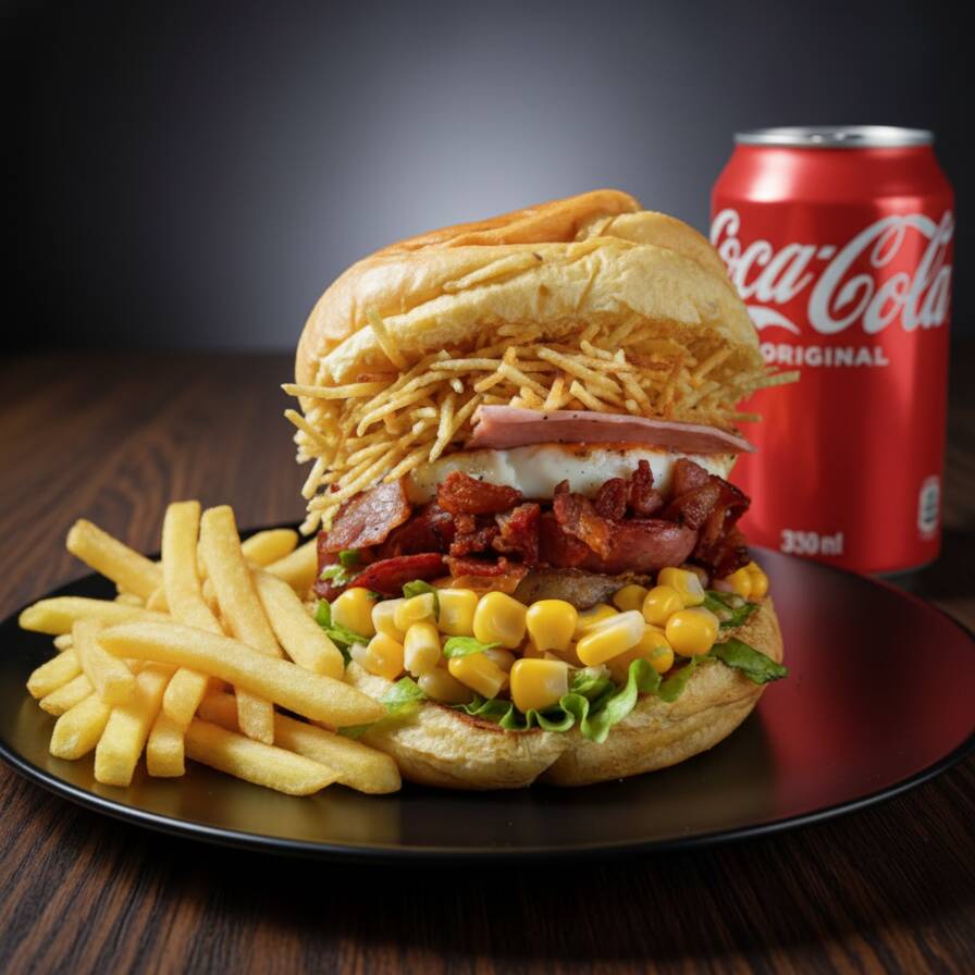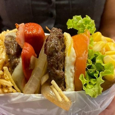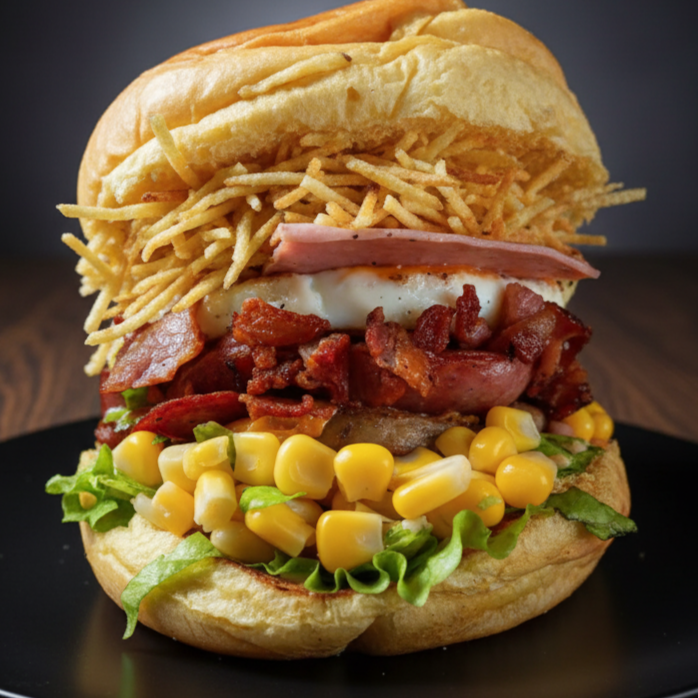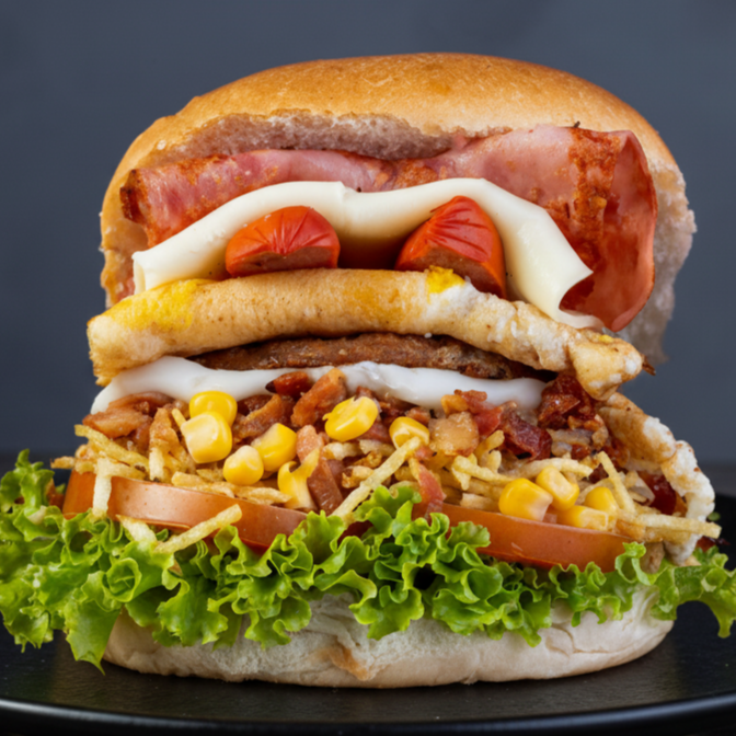 Pão macio, 100g de hambúrguer tradicional suculento, presunto, mussarela derretida, bacon crocante, ovo, salsicha, alface, tomate, milho doce e batata palha crocante. Uma explosão de sabores em cada mordida!