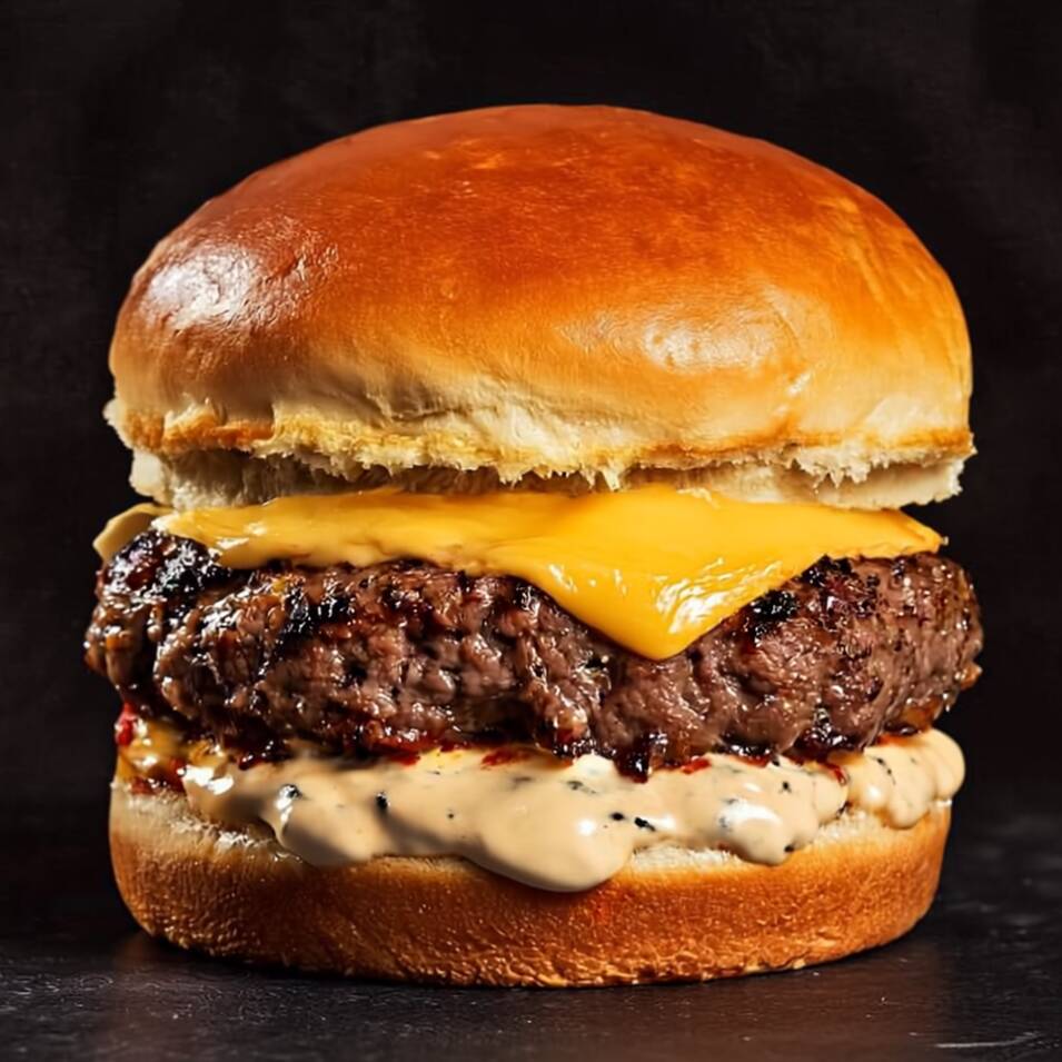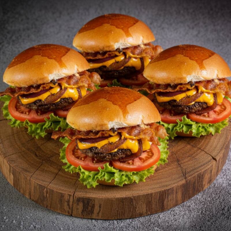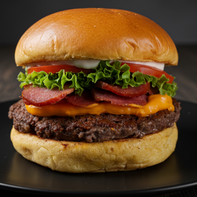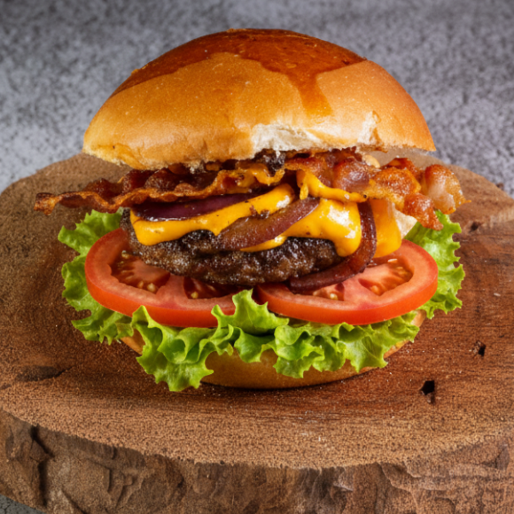 Um hambúrguer artesanal de 100g, acompanhado de duas fatias de bacon crocante, cheddar e muçarela derretidos, alface crocante e tomate fresco. Um sanduíche gourmet que conquista pelo sabor e textura.