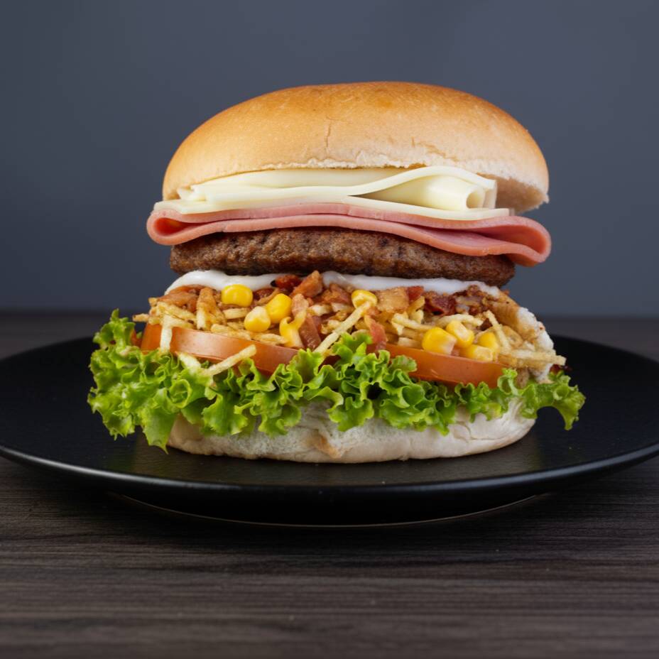 Pão macio, 100g de hambúrguer tradicional suculento, presunto, mussarela derretida, bacon crocante, ovo, alface, tomate, milho doce e batata palha. Um lanche completo e cheio de sabor!