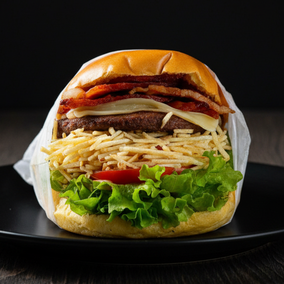 Pão macio, 100g de hambúrguer tradicional suculento, presunto, mussarela derretida, bacon crocante, alface, tomate, milho doce e batata palha crocante. Sabor clássico com aquele toque irresistível de bacon!