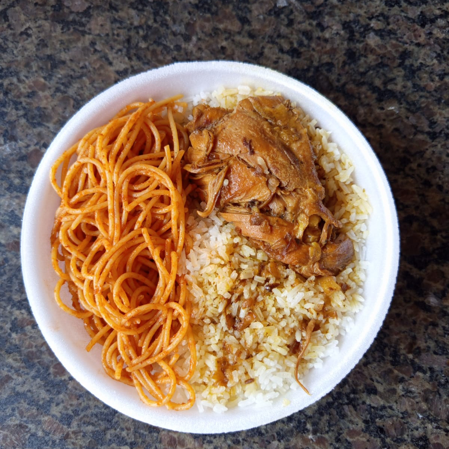 Frango ao molho com arroz branco e macarrão espaguete com extrato de tomate.