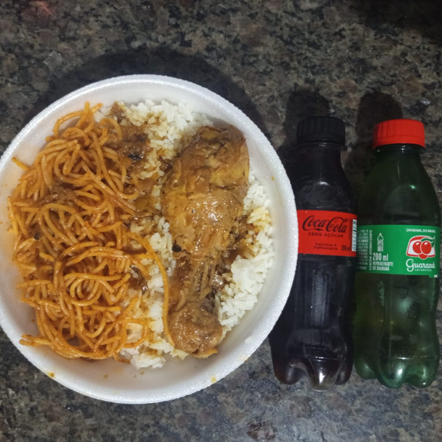 Frango ao molho com arroz branco e macarrão espaguete com extrato de tomate + refrigerante