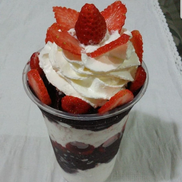 Açaí Tradicional acompanhado de Leite condensado , Ovomaltine , Gotas de Chocolate , e Leite Ninho . ( Em cada Copo)