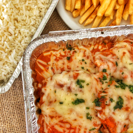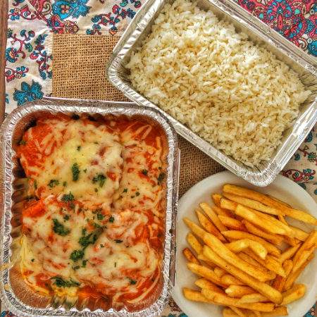 Delicie-se com a nossa 'Parmegiana de Filé de frango suculento, filé de frango(380gr) é cuidadosamente empanado, coberto com um autêntico molho de tomate e gratinado com queijo derretido ao ponto certo. O prato é generosamente servido com (300g) dse arroz branco soltinho e (200g) de batatas fritas crocante