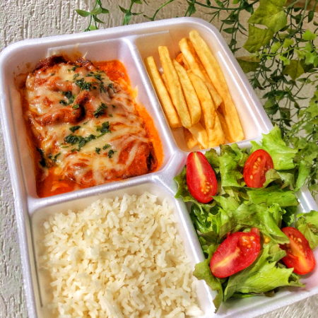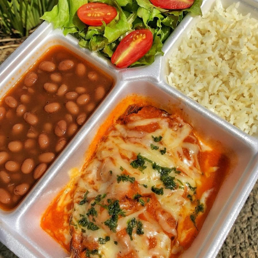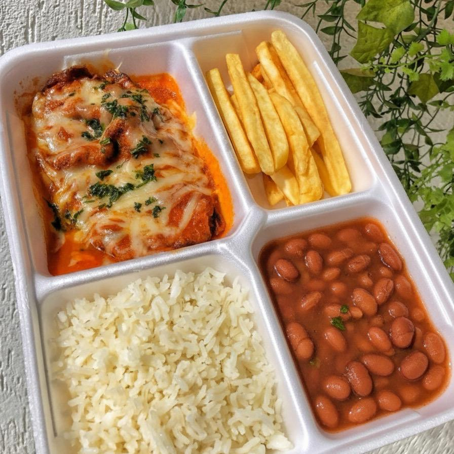 Desfrute de nosso delicioso Parmegiana de Frango Individual, cuidadosamente preparado com um suculento filé de frango(100gr) banhado em nosso autêntico molho de tomate, coberto com queijo derretido. Este prato é acompanhado de um arroz branco macio(100gr),salada de alface com tomate cereja e feijão carioca