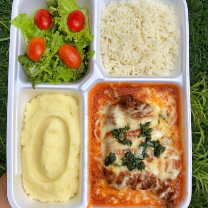 Desfrute de nosso delicioso Parmegiana de Frango Individual, cuidadosamente preparado com um suculento filé de frango(100gr) banhado em nosso autêntico molho de tomate, coberto com queijo derretido. Este prato é acompanhado de um arroz branco macio(100gr), purê de batata (industrial)100gr)e uma refrescante salada de tomate cereja e alface fresquinha.