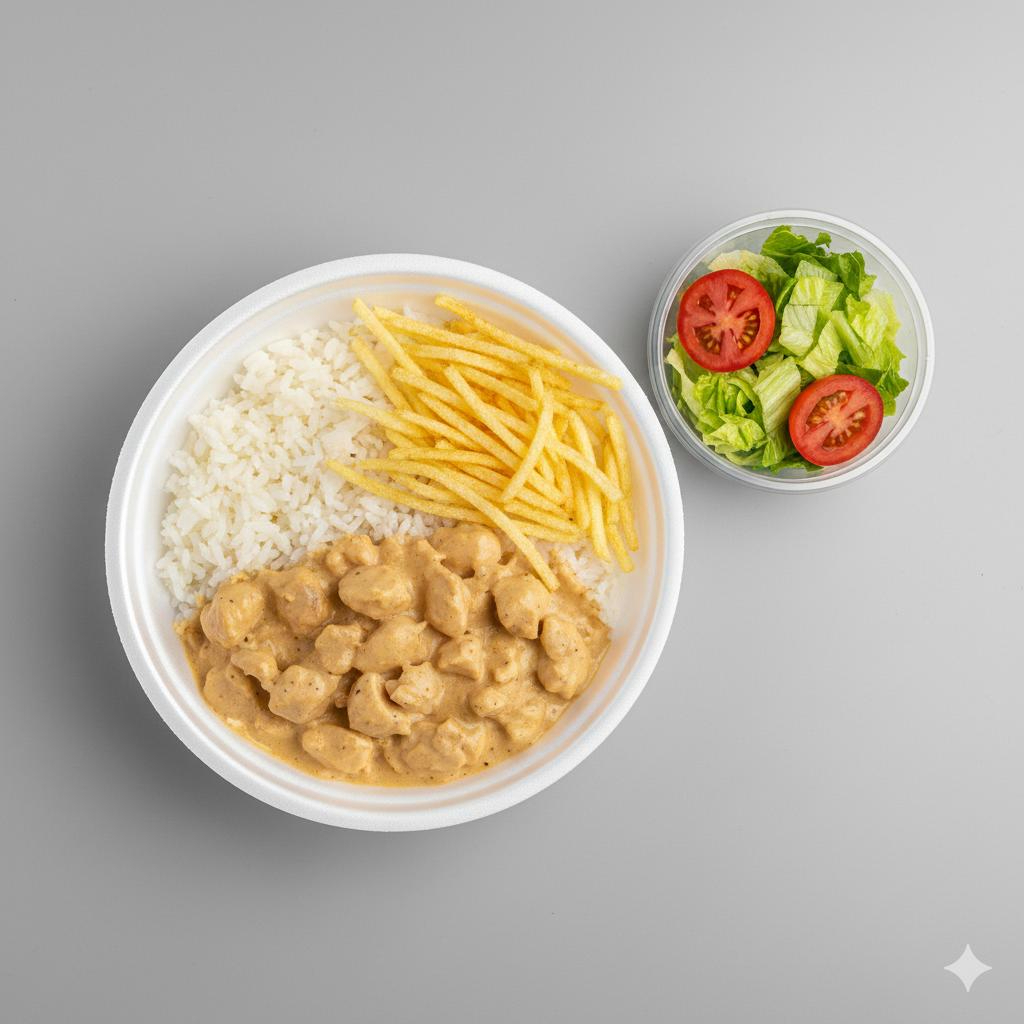 Clássico strogonoff de frango com molho cremoso de creme de leite e champignon, servido com arroz e batata palha.