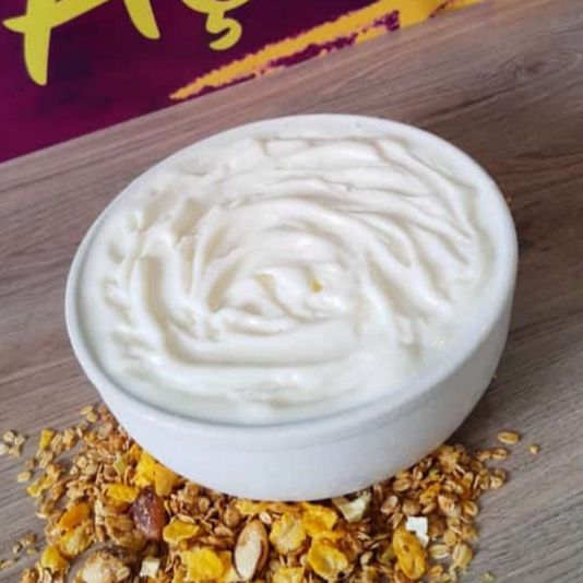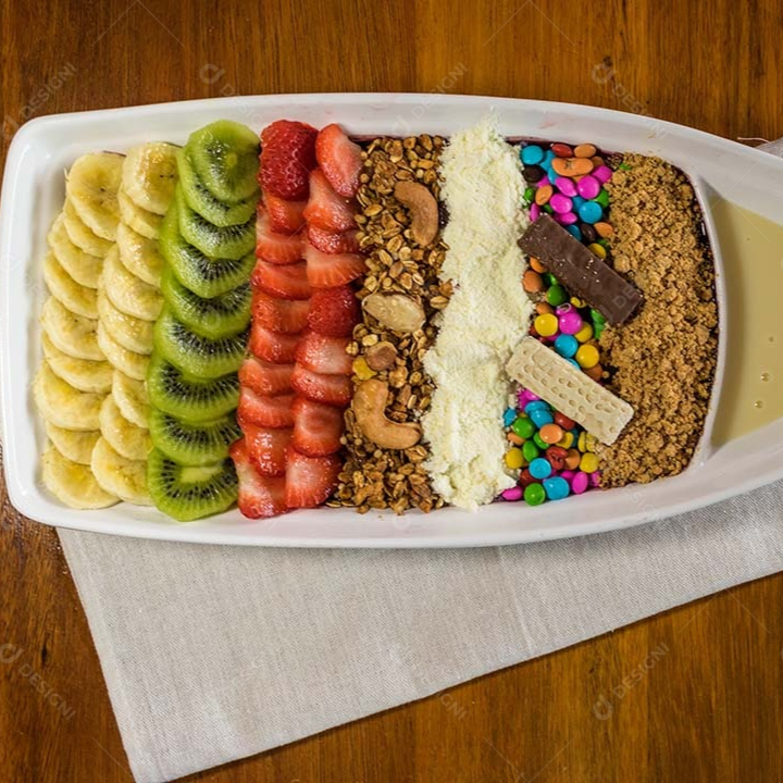 Acompanhado de Leite condensado , Granola , Paçoca e leite em pó.