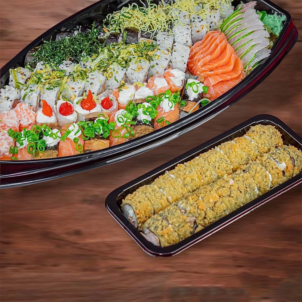 10 Sashimis Salmão,10 Sashimis Tilapia,4 Gunkan Shake,4 Gunkan Salmão,4 Gunkan Tilapia,4 Gunkan Camarão,4 Niguiri Salmão,4 Niguiri Tilapia,4 Niguiri Skin,4 Uramaki Salmão,4 Uramaki Fil., 4 Uramaki Patê, 5 Hossomaki F. 5 Hossomaki skin, 5 Hossomaki Patê, 10 Hot F. (Imagem ilustrativa)