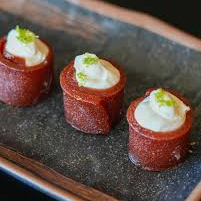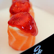 Geleia de morango é usada nos gunkans para adicionar um contraste de sabor adocicado e frutado que equilibra a salinidade do peixe e a cremosidade do cream cheese,