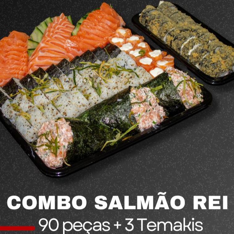 30 sashimis de salmão,10?gunkan de cream cheese,20 Uramaki Filadélfia,10 Uramaki de salmão especial , 20 hot Filadélfia e 3 temakis de salmão completo.