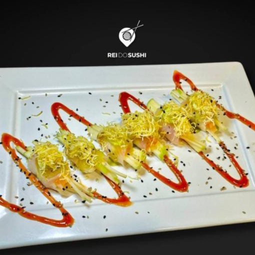 ACELGA ENVOLVIDA NO ARROZ COM RECHEIO DE SALMÃO,CREAM CHEESE, GELEIA DE PIMENTA E CEBOLINHA.