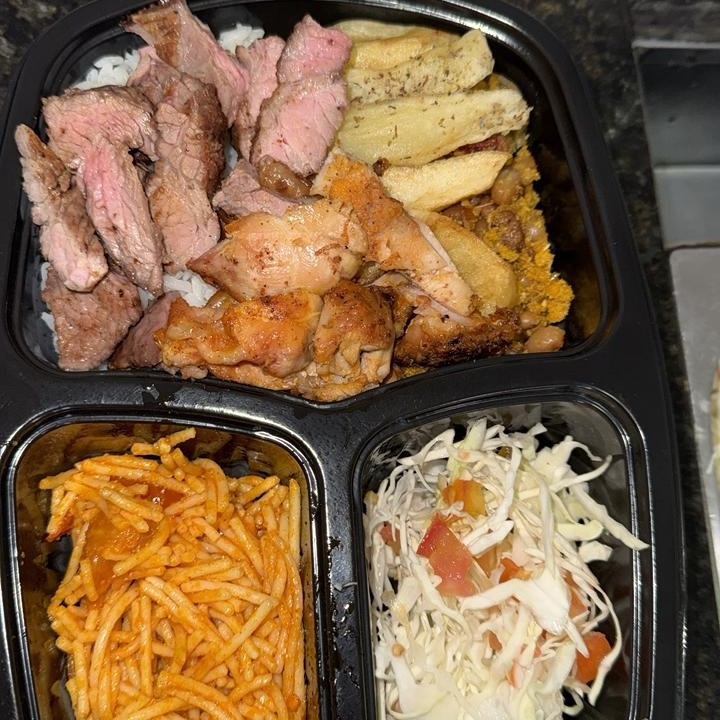 Acompanha: Arroz,feijao de caldo ou tropeiro,macarrao,batata frita,salada separada e churrasco + Refri lata