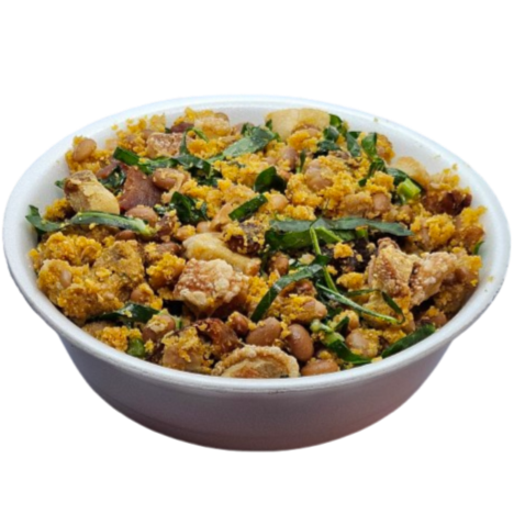 Arroz, feijão, macarrão ou purê, 1 verdura, 1 fritura, 2 carnes e 1 salada. Selecionamos os itens mais pedidos e montamos uma marmita completa e caprichada à moda da casa. Média 900g. A salada vai em uma vasilha separada.