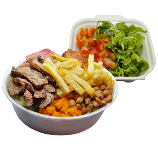6 Opções e 2 Carnes. Média 900g. Salada vai em vasilha separada.