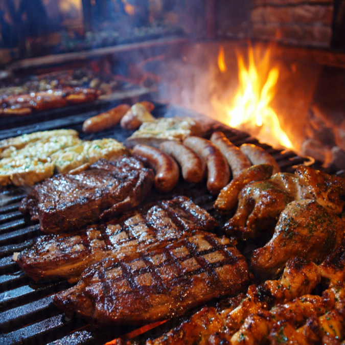 Arroz branco cremoso feito com amor , feijão tropeiro uma receita autêntica que vai te fazer sentir em casa, mandioca com manteiga do sertão, batata frita crocante , salada fresca com ingredientes selecionados . E o churrasco na brasa, com uma variedade de carnes para todos os paladares: Carne bovina ao ponto certo, Linguiça toscana com um toque especial de tempero, Frango grelhado suculento ,Suína preparada com carinho e cuidado !