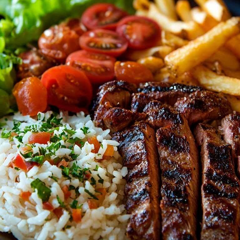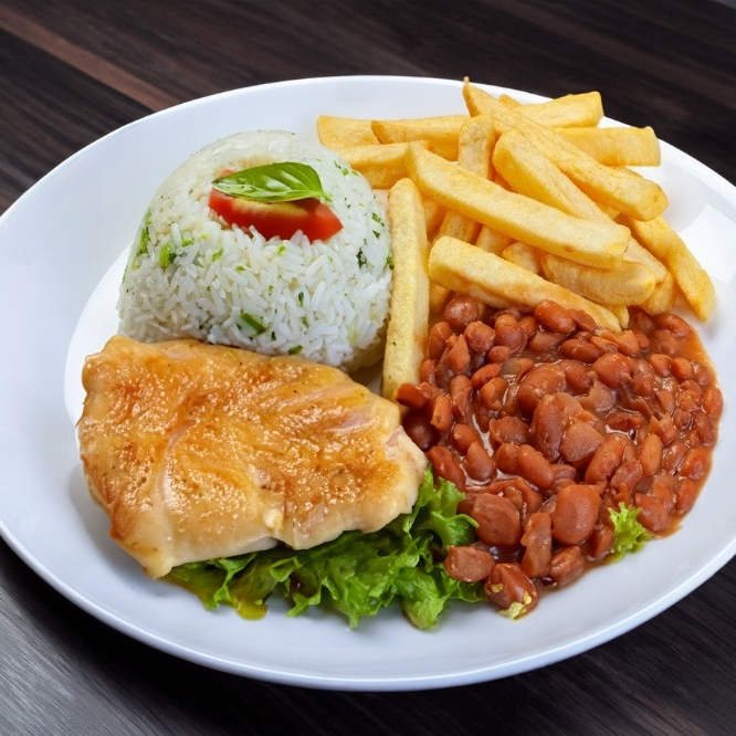 Arroz, feijão, salada , batata frita e carne (frango ao molho ou bife acebolado ou bife file de frango)