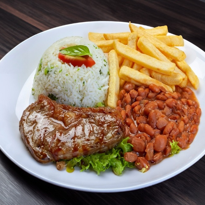 Arroz, feijão, batata frita, salada e carne (bife de figado, bife acebolado, carne de porco, file de frango)