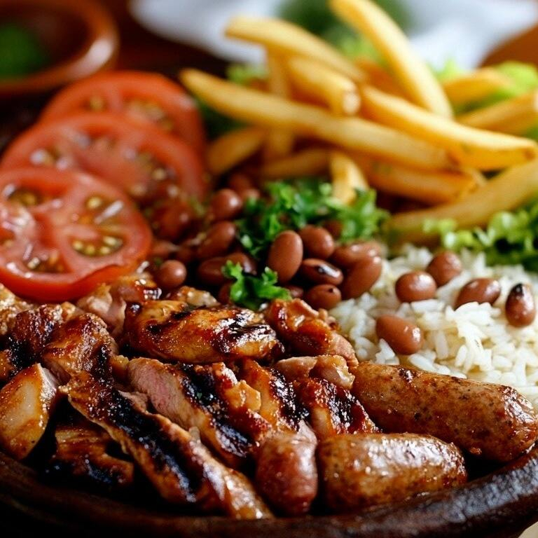 Arroz, feijoada, batata frita, salada e carne (Carne moida, frango frito, bife acebolado, file de frango)
