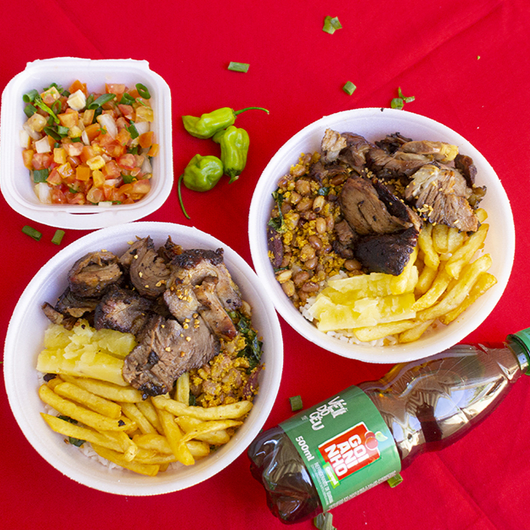 duas marmitex de churrasco, acompanha arroz feijão, batata frita, mandioca, vinagrete e o refri a a escolha