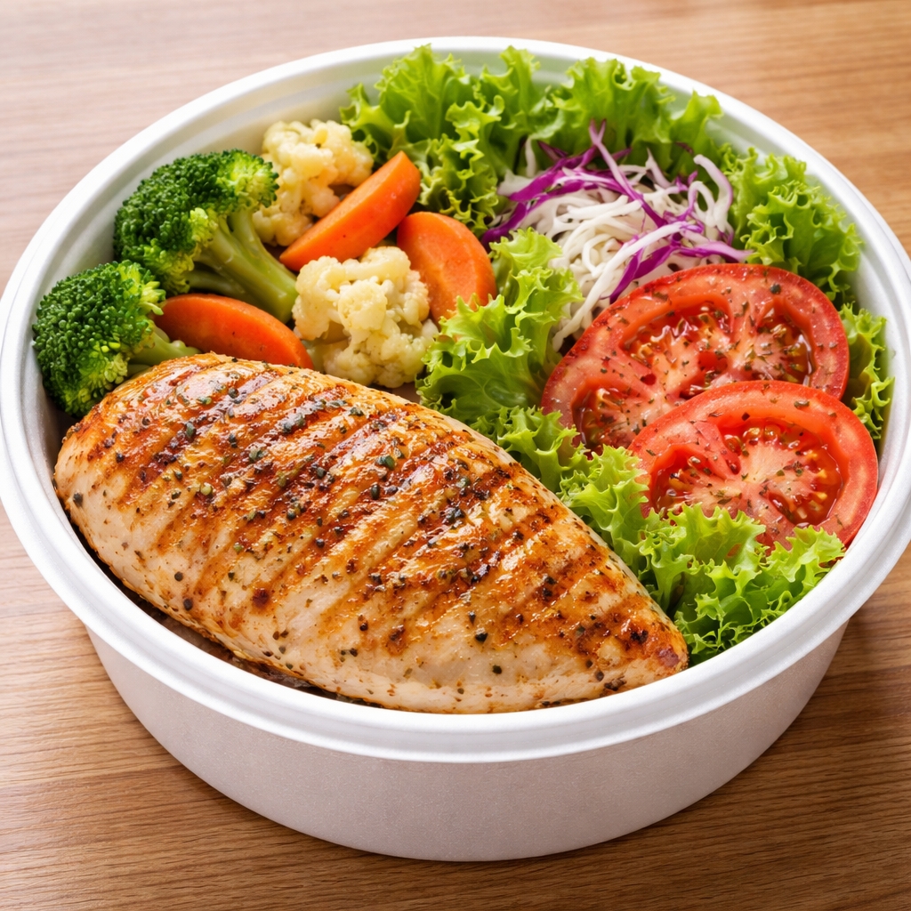 Legumes cozidos ao vapor do dia , saladas frescas e bife de frango ou file de sobrecoxa na grelha