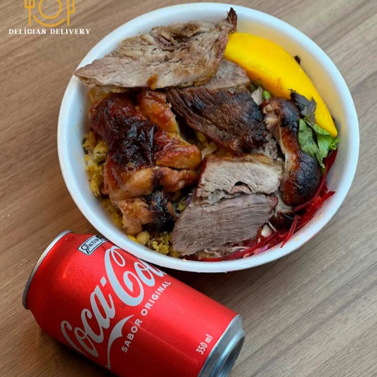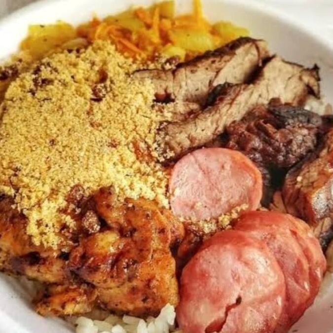 Arroz branco,2 verdura cozida, feijão caldo, macarrão, farofa e saladas
