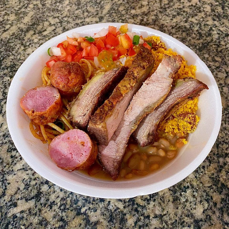 Acompanha: arroz, feijão tropeiro, carne e linguiça assada, mandioca cozida, macarrão e tomate com repolho