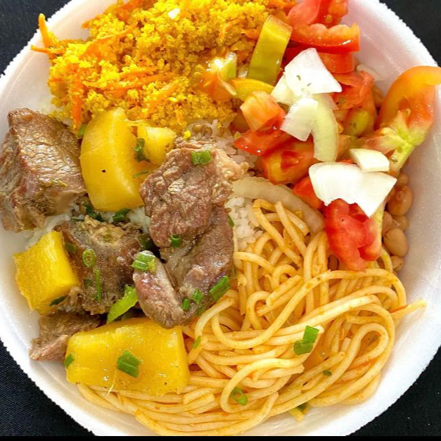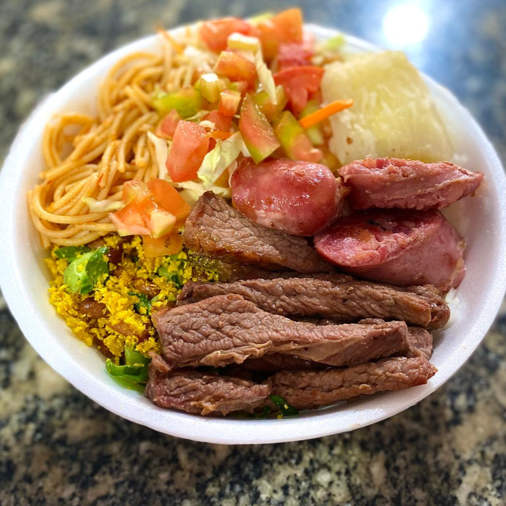 Acompanha: arroz, feijão de caldo, macarrão, farofa, carne cozida com mandioca e tomate com repolho