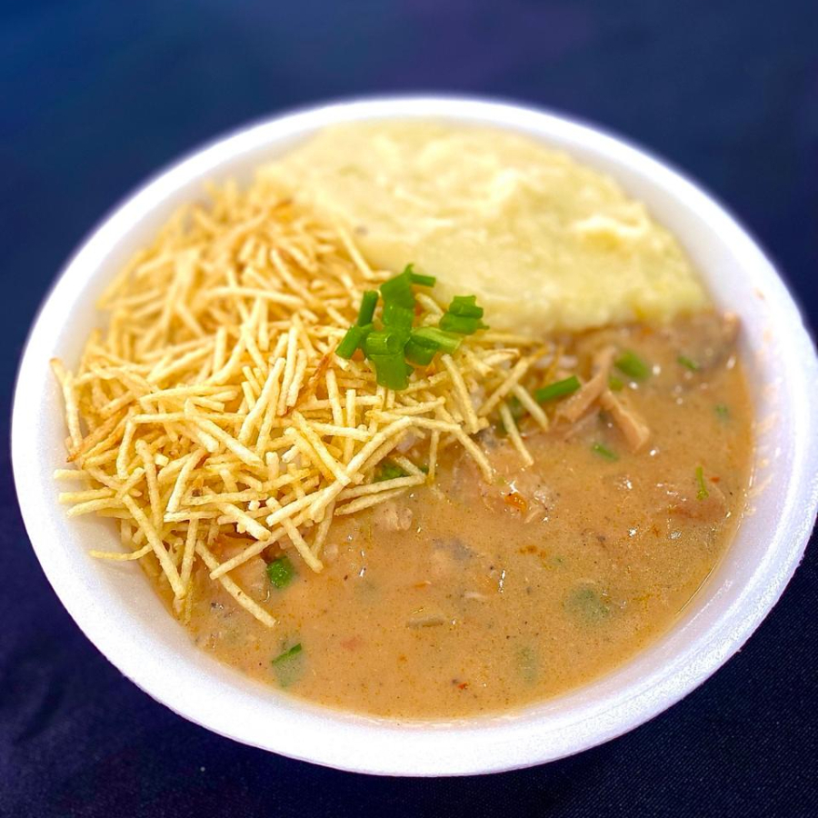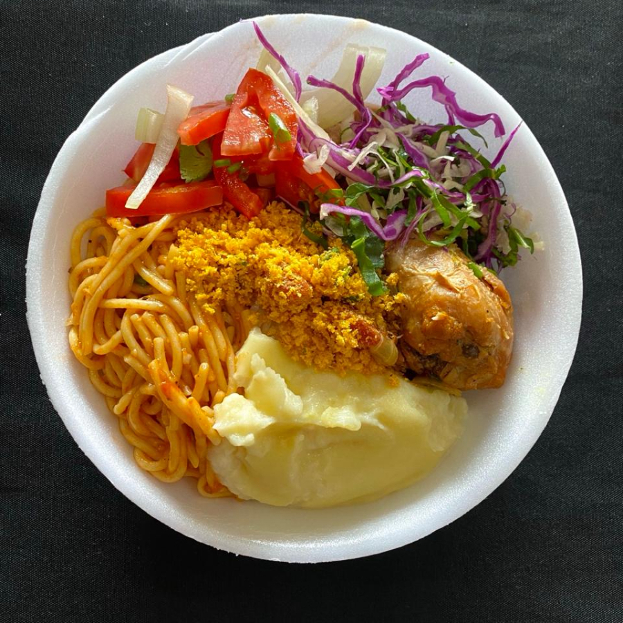 Acompanha: arroz, feijão de caldo, frango ao molho, purê de batata, farofa, macarrão e tomate com repolho