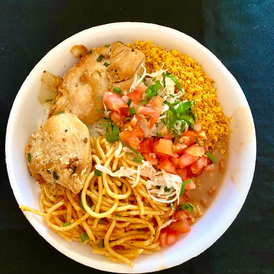 Acompanha: arroz, feijão de caldo, frango acebolado, farofa, macarrão e tomate com repolho