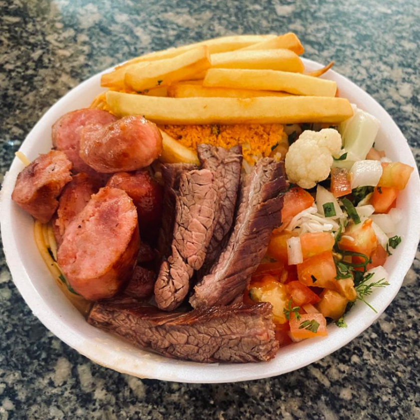 Acompanha: arroz, feijão de caldo, carne e linguiça assada, farofa, macarrão, batata frita, tomate, brócolis e couve flor